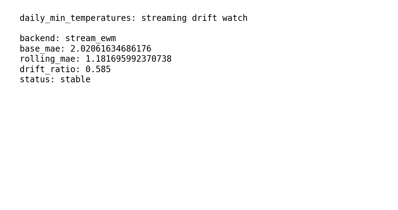 assets/daily-min-temperatures/history.csvOpen artifactassets/daily-min-temperatures/forecast.csvOpen artifactassets/daily-min-temperatures/leaderboard.csvOpen artifactassets/daily-min-temperatures/forecast.pngOpen artifactassets/daily-min-temperatures/forecast_card.pngOpen artifactassets/daily-min-temperatures/backend_comparison.pngOpen artifactassets/daily-min-temperatures/leaderboard_card.pngOpen artifactassets/daily-min-temperatures/winner_vs_runnerup_delta.pngOpen artifactassets/daily-min-temperatures/summary.mdOpen artifactassets/daily-min-temperatures/metadata.jsonOpen artifactassets/daily-min-temperatures/drift_alert_card.pngOpen artifact